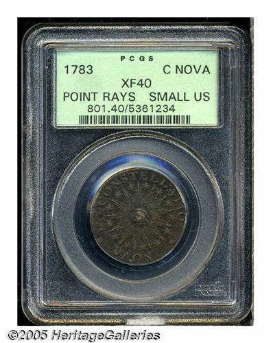 <B>1783<COPPER> Nova Constellatio Copper, Pointed Rays, Small US XF40 PCGS.</B></I> Crosby 2-B, R.2. A bold and suitably centered example, mostly deep brown in color with an area of lighter tan toning on the central reverse. Some flaking on the small U.S., otherwise only faintly granular. In a green label holder. Listed on page 40 of the 2005 <I>Guide Book.</B></I>