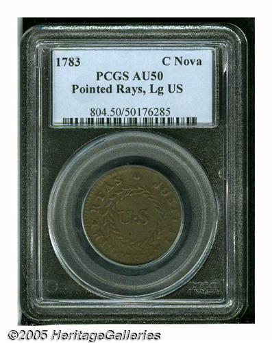 <B>1783<COPPER> Nova Constellatio Copper, Pointed Rays, Large US AU50 PCGS.</B></I> Crosby 1-A, R.3. A late die state that remains sharp in the centers, albeit the peripheral legends are blurred. Pleasing light chocolate-brown in color, no marks are worthy of mention, and the centering is good if not quite perfect. Listed on page 40 of the 2005 <I>Guide Book.</B></I>