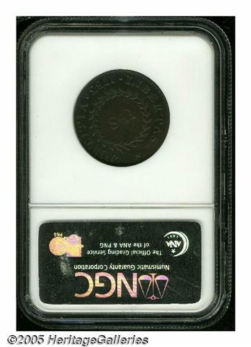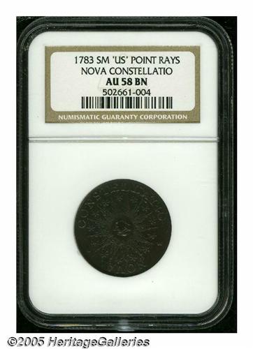 <B>1783<COPPER> Nova Constellatio Copper, Pointed Rays, Small US AU58 NGC.</B></I> Crosby 2-B, R.2. A partly lustrous dark brown example. Crisply struck and lightly marked. The late state with a die break (as made) on the rays beneath the eye. An interesting incused semi-circle near the Small US appears to have been a flaw on the planchet prior to the strike. Listed on page 40 of the 2005 <I>Guide Book.</B></I>