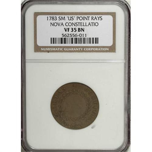 <B>1783 COPPER Nova Constellatio Copper, Pointed Rays, Small US VF35 NGC.</B></I> NGC Census: (0/0). PCGS Population (16/81). (#801)<BR><BR><b>Shipping:</b> Coins & Currency (<a target="_blank" href="http://www.heritageauctions.com/common/shipping.php">view shipping information</a>)