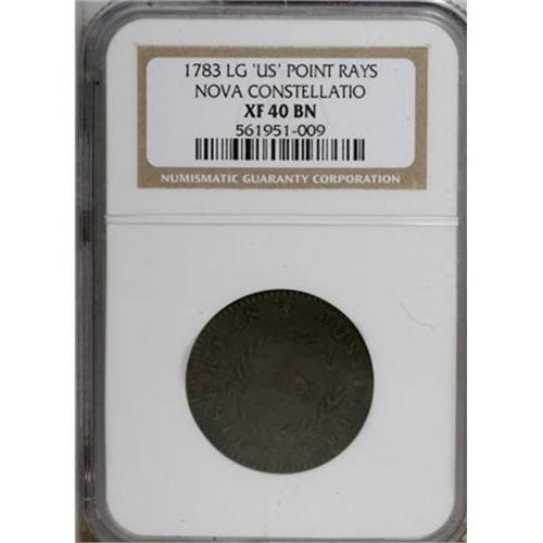 <B>1783 COPPER Nova Constellatio Copper, Pointed Rays, Large US XF40 NGC.</B></I> Crosby 1-A, R.3. A lightly circulated, minimally marked piece that exhibits this issue's typical softness at the central devices and the date. A die break extends from the second O in CONSTELLATIO into the rays. Listed on page 52 of the 2008 <I>Guide Book</B></I>.<BR><BR><b>Shipping:</b> Coins & Currency (<a target="_blank" href="http://www.heritageauctions.com/common/shipping.php">view shipping information</a>)