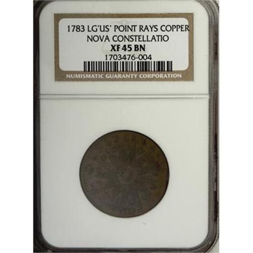 <B>1783 COPPER Nova Constellatio Copper, Pointed Rays, Large US XF45 NGC.</B></I> Crosby 1-A, R.3. This golden-brown representative is devoid of consequential contact, and is evenly struck save for some weakness on the left border of the wreath. A 4% curved clip (as made) is noted at 2:30. Listed on page 52 of the 2008 <I>Guide Book.</B></I><BR><BR><b>Shipping:</b> Coins & Currency (<a target="_blank" href="http://www.heritageauctions.com/common/shipping.php">view shipping information</a>)