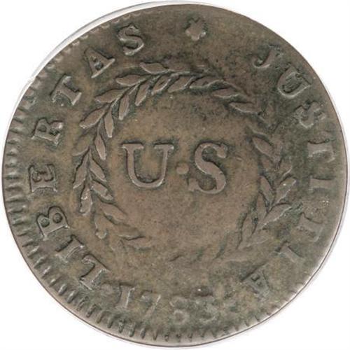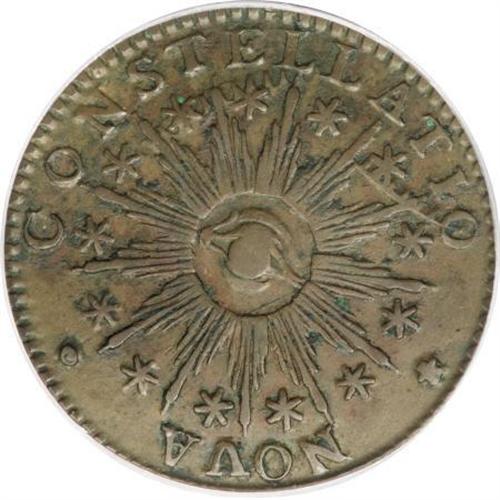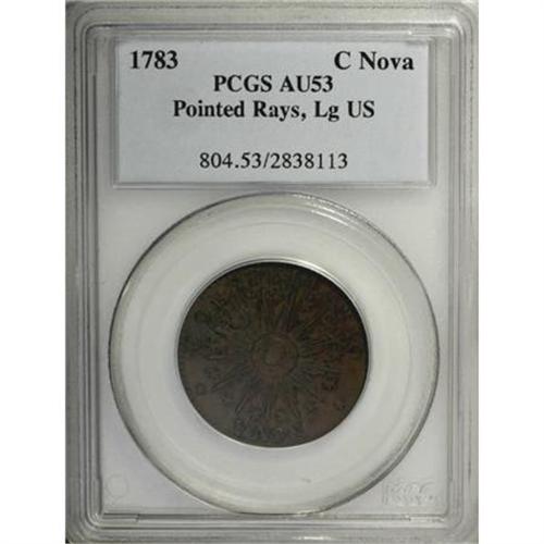 <B>1783 COPPER Nova Constellatio Copper, Pointed Rays, Large US AU53 PCGS.</B></I> Crosby 1-A, R.3. This chocolate-brown piece displays luster throughout the rays, wreath, and letters. Portions of the wreath are incompletely brought up, but the obverse is sharply struck. Protected regions exhibit minor build-up. Listed on page 52 of the 2008 <I>Guide Book.</B></I><BR><BR><b>Shipping:</b> Coins & Currency (<a target="_blank" href="http://www.heritageauctions.com/common/shipping.php">view shipping information</a>)