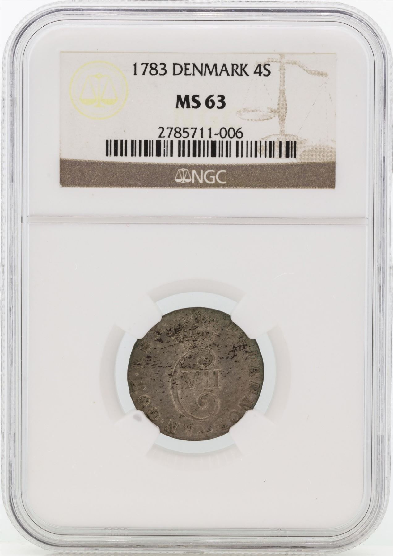 One 1783 Denmark 4 Skilling Coin NGC MS63.
