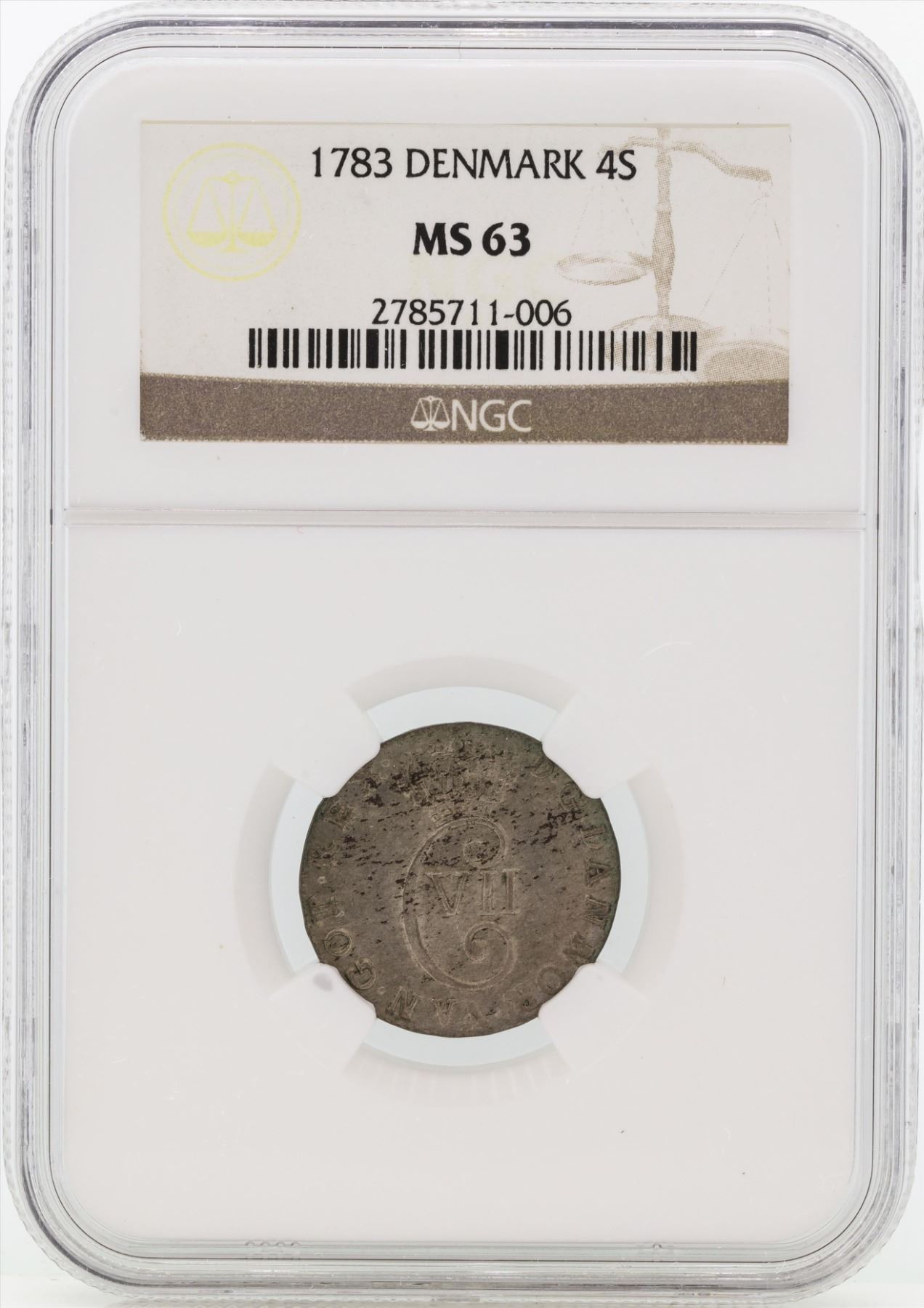 One 1783 Denmark 4 Skilling Coin NGC MS63.