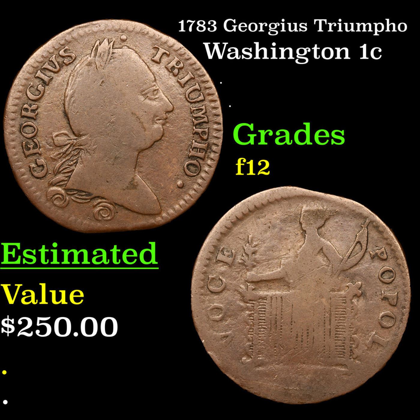 1783 Georgius Triumpho Washington 1c Grades f, fine. An enigmatic issue that was long thought to be satirical in nature, as the bust resembles George III rather than George Washington. Unlike most Washington pieces dated in the 1780s, the Georgivs Triumpho token was actually struck during that decade. Examples were used as a host for the 1787 Maris 73-aa New Jersey coppers. The portrait resembles Washington less than another famous George from the era, King George III, perhaps because a bust or painting of Washington was not available to the engraver.