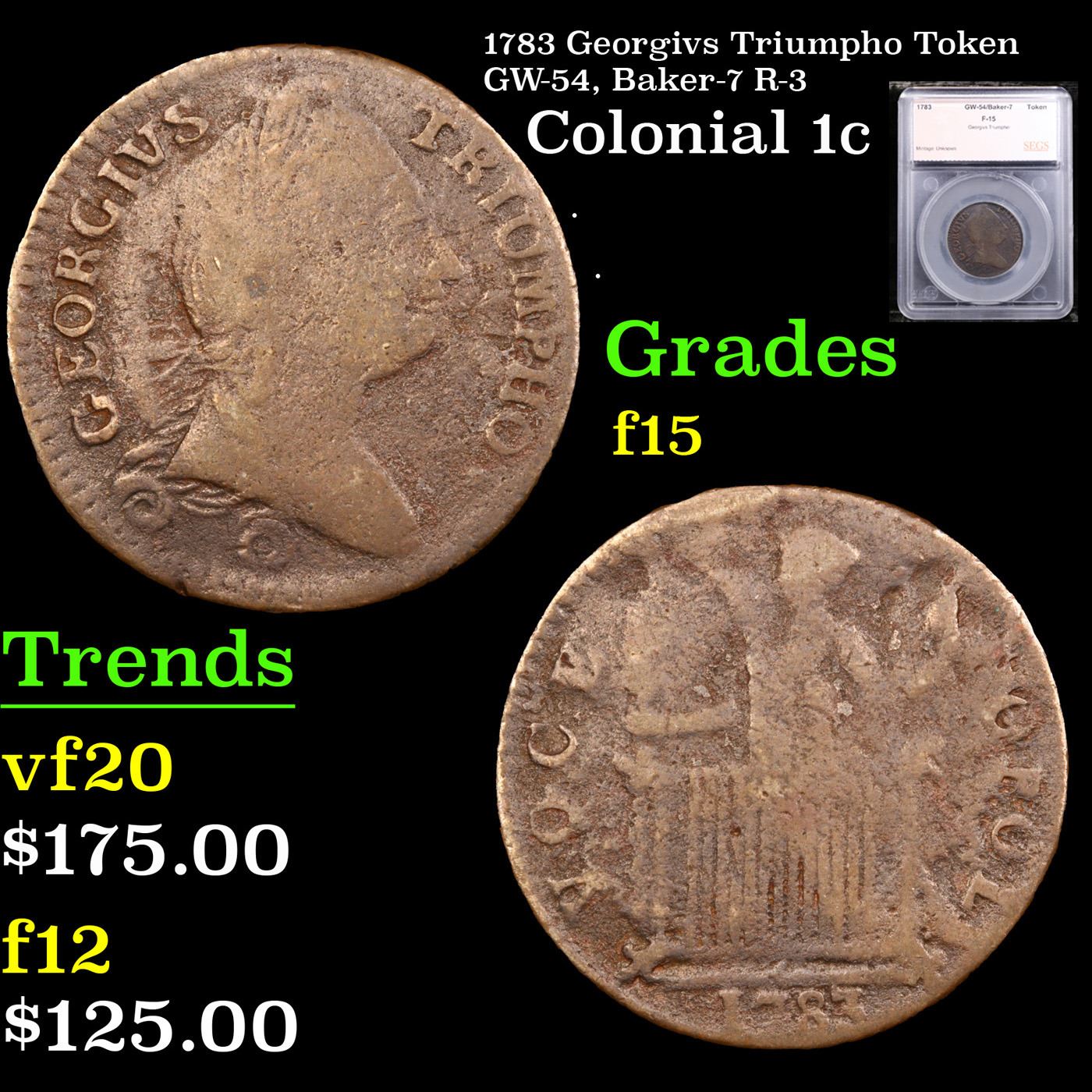 1783 Georgivs Triumpho Token GW-54, Baker-7 R-3 Colonial Cent 1c Graded f15 By SEGS.