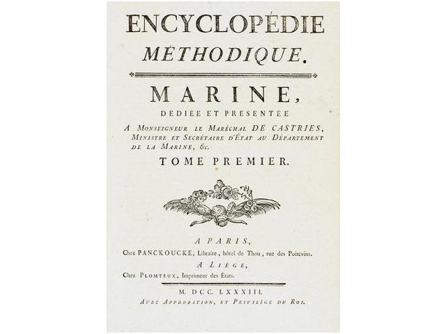 1783,. LIBRO: (NAVEGACION),. ENCYCLOPEDIE METODIQUE OU PAR ORDRE DES MATIERES., Par une société de Gens de Lettres, de savants et d´artistes... orné des portaits de Mr. Diderot et d´Alembert, premiers Éditeurs de l´Encyclopédie. A Paris: chez Panckoucke; A Liège: chez Plomteux, 1783. vol. en 4º. 700 p. aprox. c/u. y 1 vol. en folio con 170 láminas. Papel de hilo barbado. Buen ejemplar con amplios márgenes y fresco papel. Enc. en plena piel, nervios, doble tejuelo, lomo cuajado, hierros en los cantos.