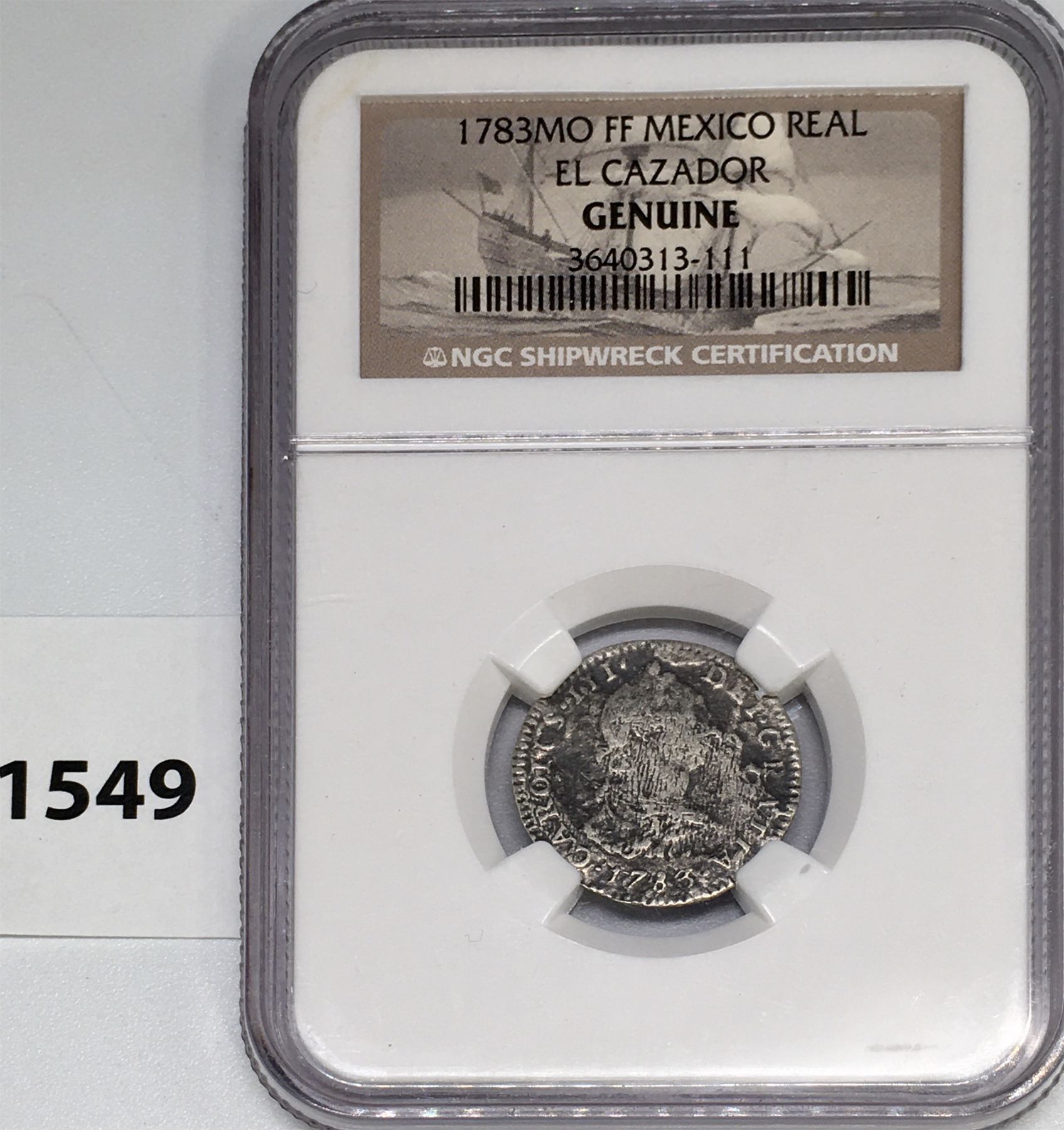 THE EL CAZADOR WAS A SPANISH BRIG THAT SANK IN THE GULF OF MEXICO IN 1784. THE SHIPWRECK WAS DISCOVERED IN 1993 AND SALVAGE OPERATIONS BEGAN SHORTLY AFTER YIELDING NUMEROUS SILVER COINS INCLUDING THIS EXAMPLE.
