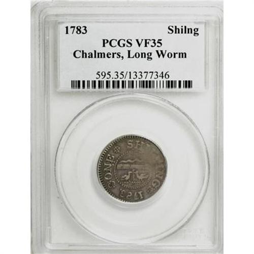 <B>1783 SHLNG Chalmers Shilling, Long Worm VF35 PCGS.</B></I> Breen-1012. Scarcer than the Short Worm shilling, although any example of this Maryland silversmith's coinage is difficult to find. The auction record of $37,375 for a Long Worm shilling (in AU58) was set in last year's FUN auction. This cream-gray example is smooth aside from a thin mark beneath the worm, and has only localized softness on the right-side borders. Listed on page 49 of the 2008 Guide Book. <BR><BR><b>Shipping:</b> Coins & Currency (<a target="_blank" href="http://www.heritageauctions.com/common/shipping.php">view shipping information</a>)