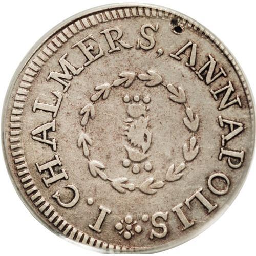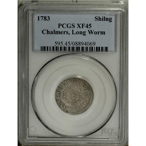 <B>1783 SHLNG Chalmers Shilling, Short Worm XF45 PCGS.</B></I> Breen-1011, Crosby Pl. IX, 5. Incorrectly designated as a Long Worm variety by PCGS. John Chalmers was an Annapolis, Maryland silversmith, who coined a series of rare silver issues to help relieve his community of cut and worn-out Spanish colonial pieces. The curious motif of two birds sharing a worm (or a branch, according to Crosby) is open to interpretation, although the then-new Federal constitution was a major issue of the date. This nicely defined cream-gray piece has a pair of minor peripheral marks, but the overall appearance is smooth. A significant opportunity for the Early American specialist. Listed on page 49 of the 2007 <I>Guide Book.</B></I><BR><I>From The Troy Wiseman Collection, Part Two.</B></I><BR><BR><b>Shipping:</b> Coin/Currency (<a target="_blank" href="http://www.heritageauctions.com/common/shipping.php">view shipping information</a>)