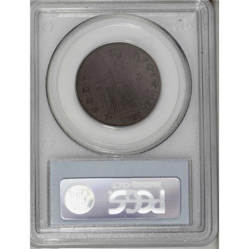 <B>1783<TOKEN> Georgivs Triumpho Token AU55 PCGS.</B></I> Baker-7, R.3. A tan-brown piece with gunmetal-gray tints on the portrait. Unusually smooth aside from a single thin mark across George's jaw. A heavy vertical die break affects the sharpness of the half-length figure, as customary for the type. Listed on page 75 of the 2007 <I>Guide Book.</B></I>