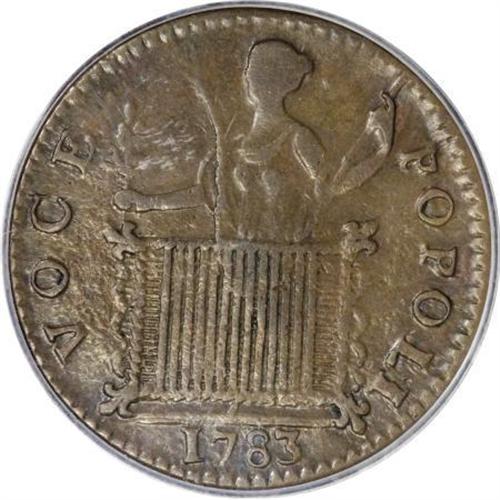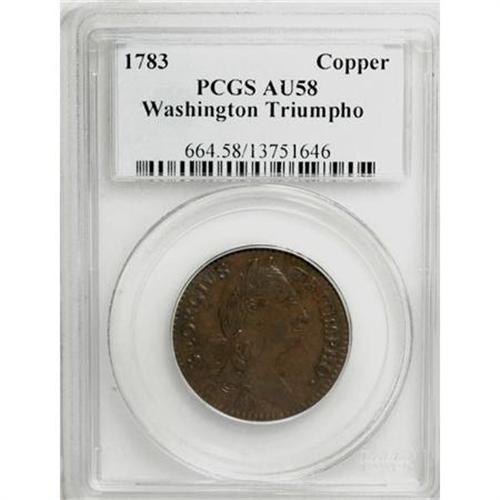 <B>1783 TOKEN Georgivs Triumpho Token AU58 PCGS.</B></I> Baker-7, R.3. The portrait perhaps more closely resembles King George III, but the Georgivs Triumpho is believed to be among the earliest Washington issues, perhaps commemorating the end of the Revolutionary War. Like most examples seen, the present piece has a large vertical die break in front of the standing reverse figure. It is a splendid and partly lustrous chocolate-brown near-Mint token without consequential marks or carbon. Listed on page 75 of the 2008 <I>Guide Book</B></I>. Population: 6 in 58, 1 finer (12/07).<BR><I>From The Liberty Collection of United States Colonial Coinage.</B></I><BR><BR><b>Shipping:</b> Coins & Currency (<a target="_blank" href="http://www.heritageauctions.com/common/shipping.php">view shipping information</a>)