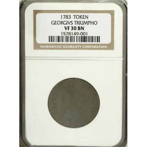 <B>1783 TOKEN Georgivs Triumpho Token VF30 NGC.</B></I> NGC Census: (0/0). PCGS Population (6/72). (#664)<BR><BR><b>Shipping:</b> Coins & Currency (<a target="_blank" href="http://www.heritageauctions.com/common/shipping.php">view shipping information</a>)