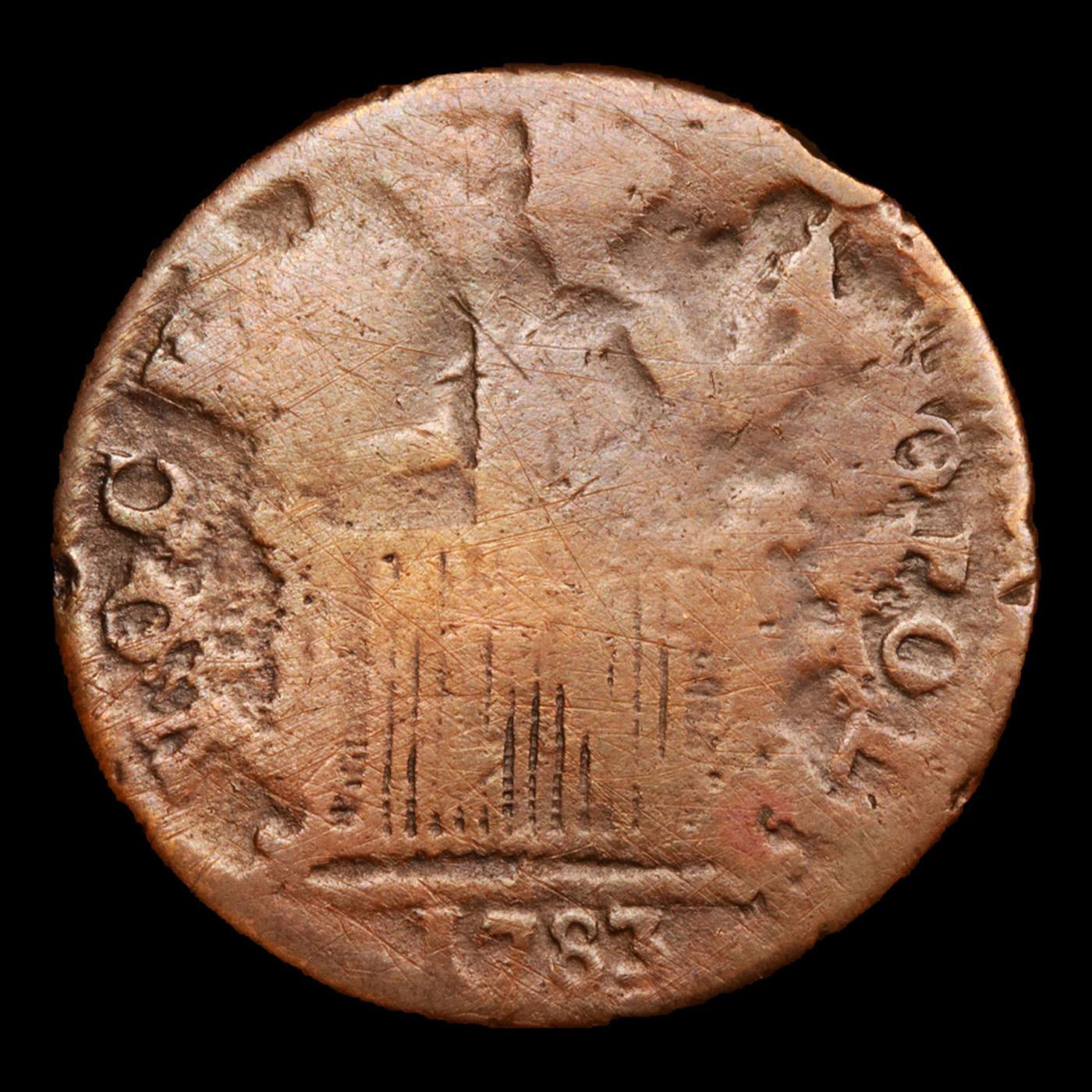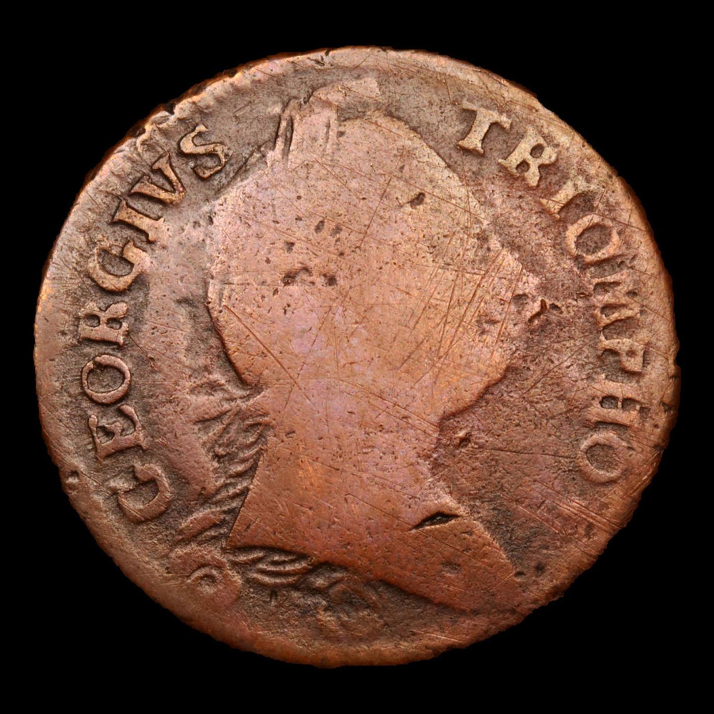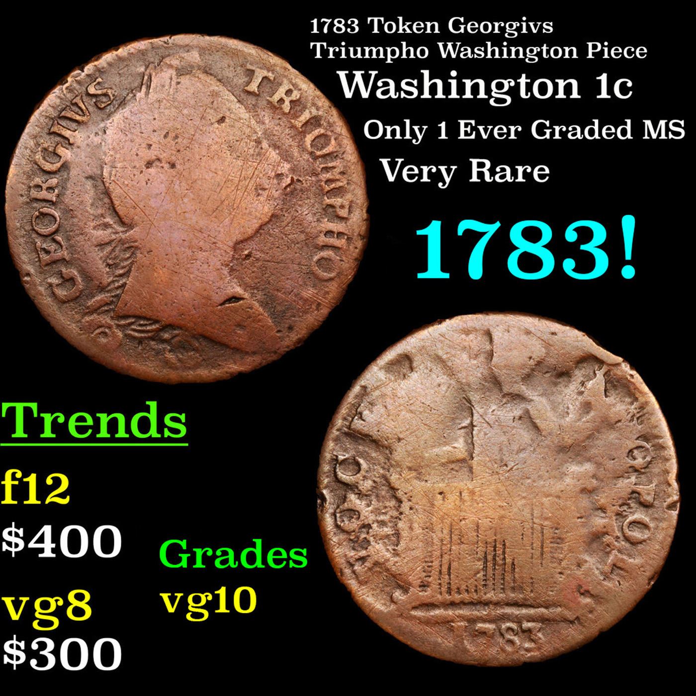 1783 Token Georgivs Triumpho Washington Piece Washington cent 1c Grades vg+. The "Georgios Triumph" is the only Washington token bearing the date of 1783 that is actually known to have circulated during the Confederation period. All other Washington tokens bearing the 1783 date, which is the date of the Treaty of Paris ending the Revolutionary War, are now known to be commemorative tokens produced during the Nineteenth century. An early date of manufacture is confirmed for the "TRIUMPH" since at least one of these pieces was used as a planchet by Matthias Ogden at his Elizabethtown, New Jersey, mint and overstruck as New Jersey coppers. The portrait resembles Washington less than another famous George from the era, King George III, perhaps because a bust or painting of Washington was not available to the engraver. Only 1 example has ever surfaced in Mint State, very scarce find!