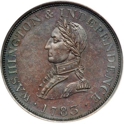 1783 Washington Cent with Small Military Bust and Plain Edge Breen-1202. PCGS graded AU-58. Frosty reddish chocolate and olive brown with hints of very faded red showing through in a couple places thanks to an old cleaning. Very sharply struck. The only marks are some microscopic ticks in the fields on both sides. Pop 4; 1 finer in 62.