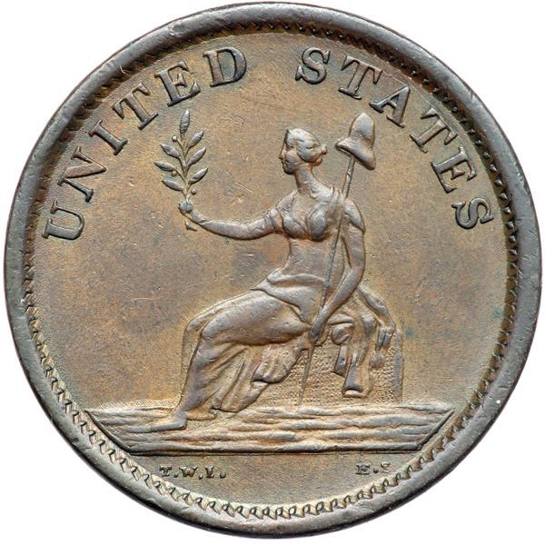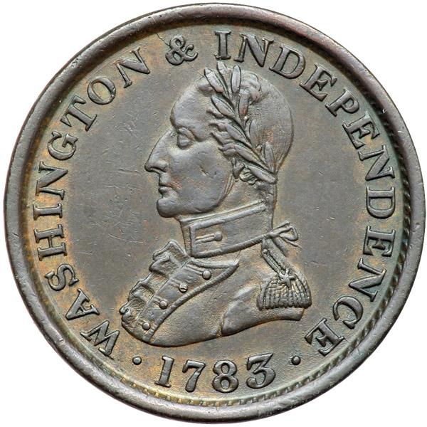 1783 Washington & Independence Cent with Large Military Bust Breen-1203 AU50. Choice frosty chocolate and light olive with lighter golden brown and tan toning in protected areas. The only mark is a tiny tick on the rim over the E in UNITED. Sharply struck and very attractive. Weight 115.1 grains.