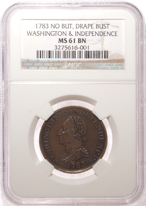 1783 Washington & Independence Draped Bust. Copper. No Button. Extremely Rare Variety. Fuld WA.NC.1783.5. Vlack 17J. Engrailed Edge with Improper Edge Application. NGC graded Mint State-61 Brown.