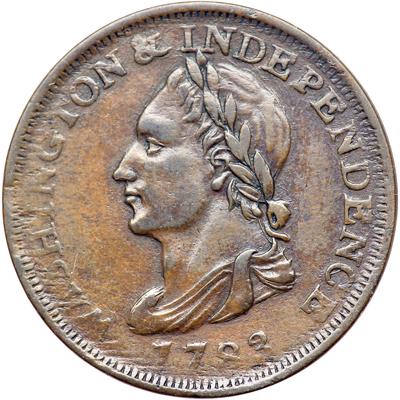 1783 Washington UNITY Cent Breen-1188. EF-40. Choice glossy chocolate brown mixed with lighter brown tones on the obverse. No roughness or contact marks. The only defects are the usual planchet striations at the dentil tips on both sides. A nice example of this popular Washington Cent.