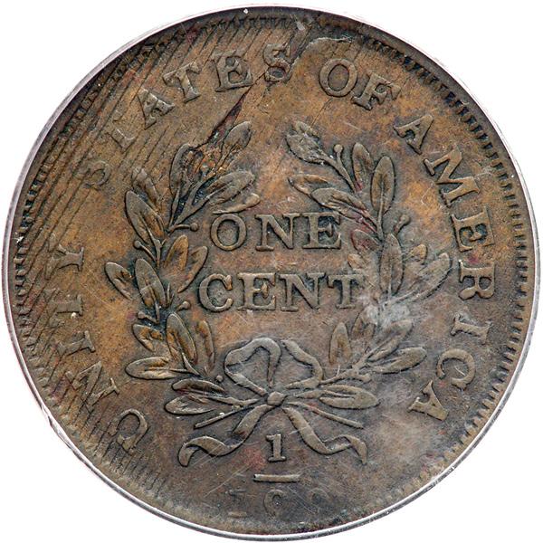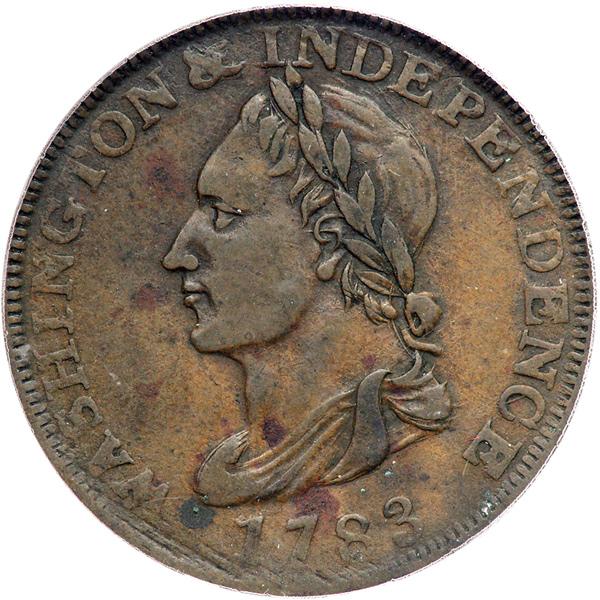1783 Washington token. "UNITY STATES" Breen-1188. PCGS graded VF-35. Medium brown and olive with a half dozen small spots of reddish chocolate toning on the obverse. A small carbon spot at the bust tip and a shallow planchet lamination slanting through the second S in STATES are the notable defects. The date and legends are complete and strong, which is not always the case with this variety thanks to the grid or file lines that were purposely added to the planchets to simulate circulation wear (wear was an indicator that the coin was acceptable in commerce) (PCGS # 689) .