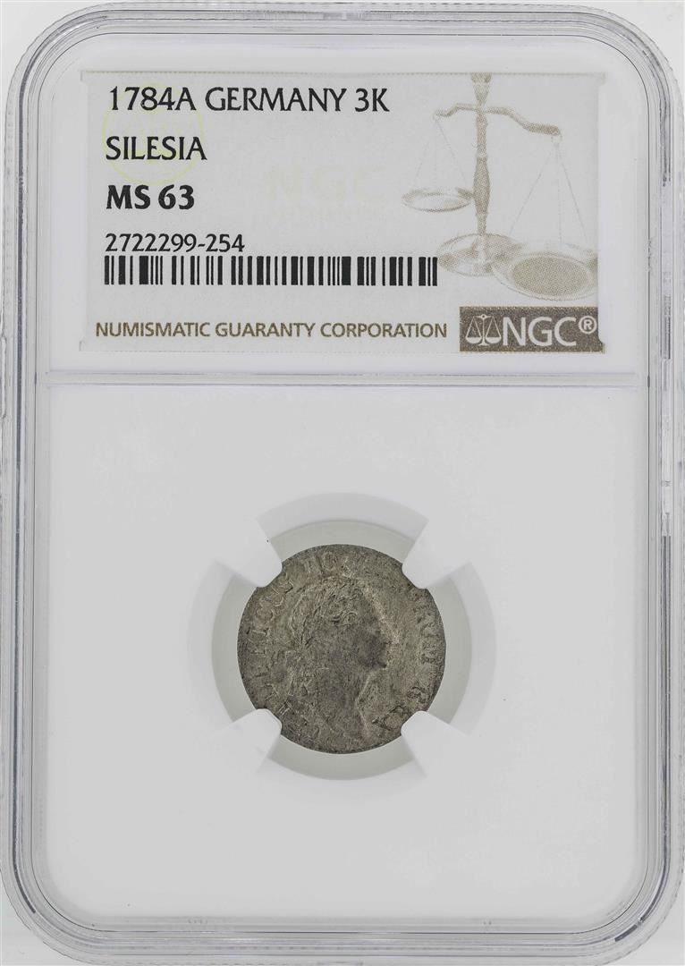 One 1784-A Germany Silesia 3 Krezuer Coin NGC MS63. NGC Certified.
