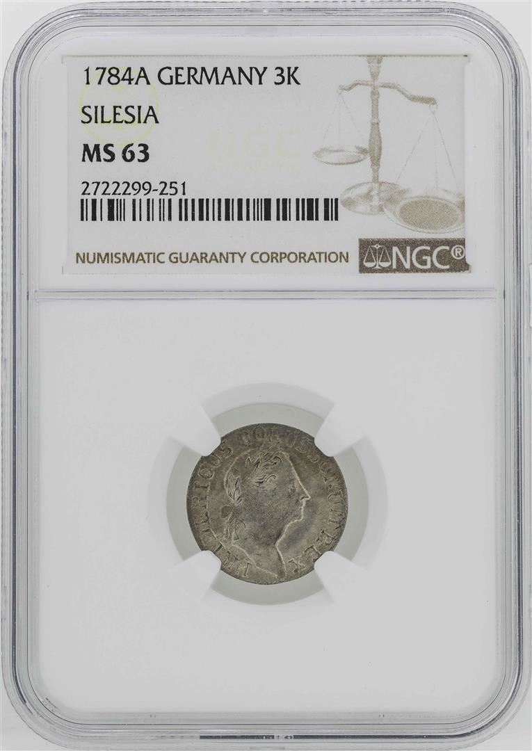 One 1784-A Germany Silesia 3 Krezuer Coin NGC MS63. NGC Certified.