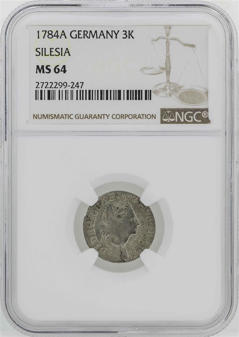 One 1784-A Germany Silesia 3 Krezuer Coin NGC MS64. NGC Certified.