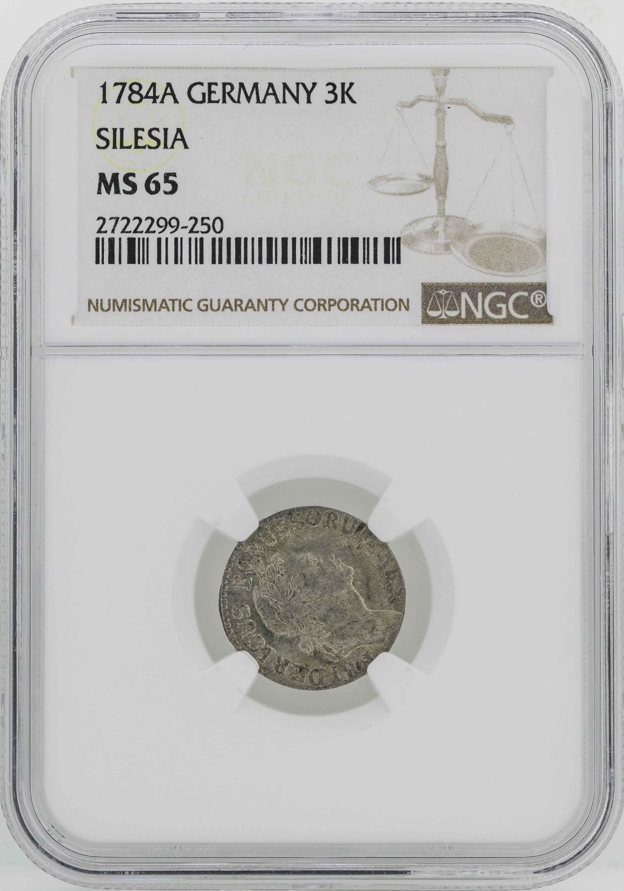 One 1784-A Germany Silesia 3 Krezuer Coin NGC MS65.