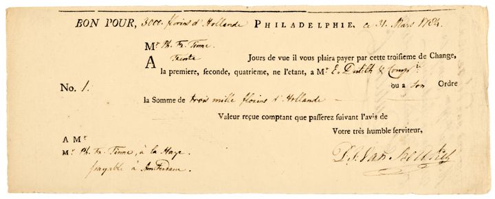 March 31, 1784-Dated, Partially-Printed Document, Philadelphia Payment Exchange Form for “PHILADELPHIE” from a French Bank, printed in French with Payment noted in Dutch, Choice Extremely Fine.