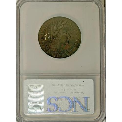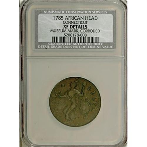 <B>1785 COPPER Connecticut Copper, African Head--Museum Mark, Corroded--NCS. XF Details.</B></I> M. 4.1-F.4, R.1. A nicely centered and attractively detailed example of this popular Connecticut variety. The mahogany-brown surfaces are surprisingly unabraded. An old-time collector's attribution is inked on the left obverse field, and faded red obverse verdigris is present beneath the chin. <BR>Listed on page 58 of the 2008 <I>Guide Book</B></I>.<BR><I>From The Liberty Collection of United States Colonial Coinage.</B></I><BR><BR><b>Shipping:</b> Coins & Currency (<a target="_blank" href="http://www.heritageauctions.com/common/shipping.php">view shipping information</a>)