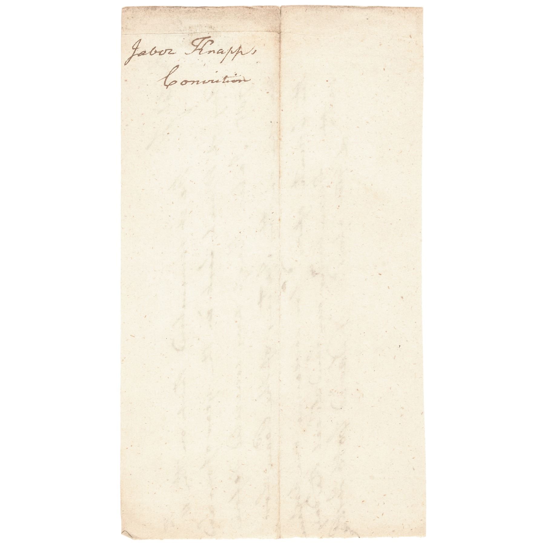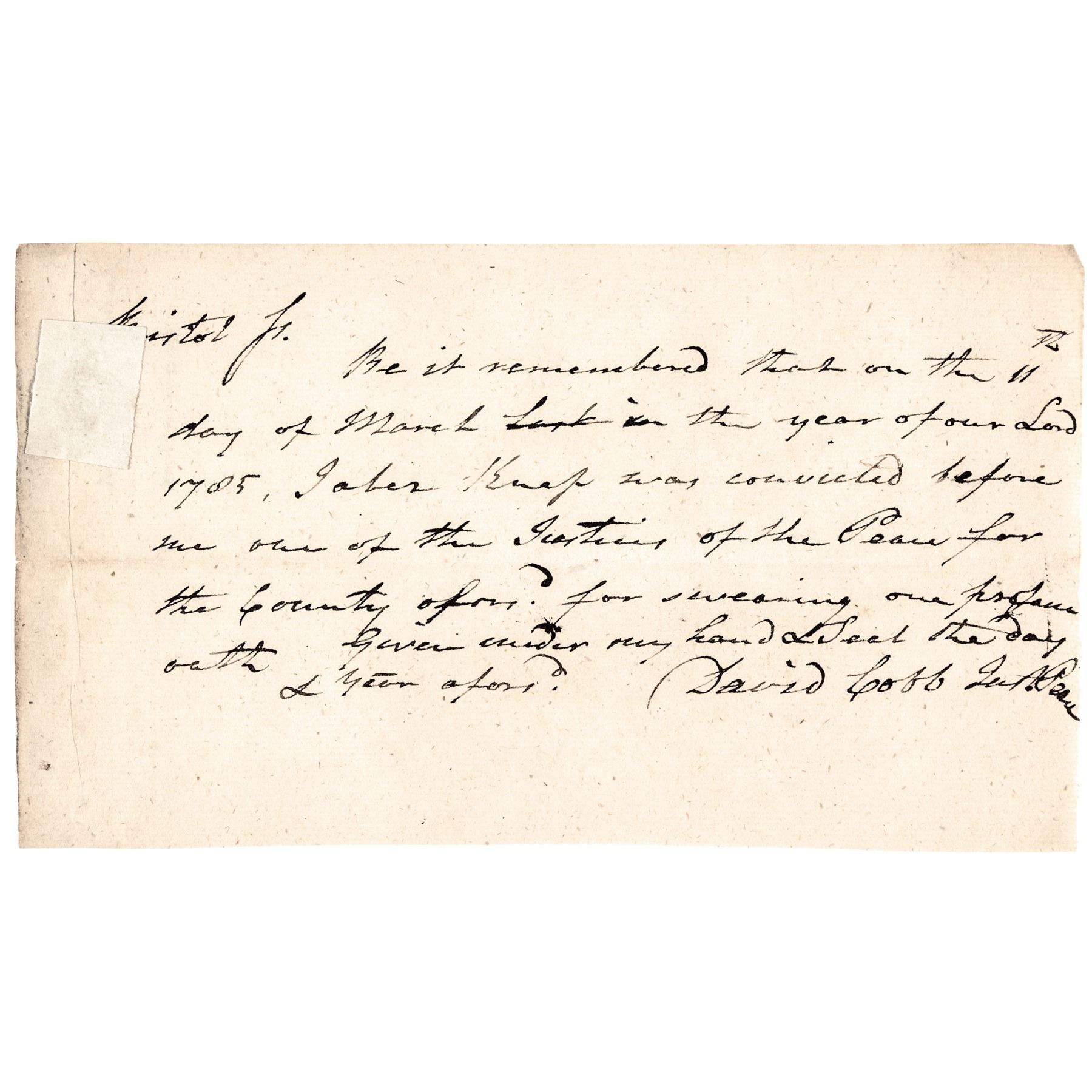 “Bristol: -- Be it Remembered that on The11th Day of March in The Year of our Lord 1785 Jabor Knapp was Convicted before Me one Of The Justices Of The Peace in and for County afore(said) for swearing one profane oath. Given under my Hand & Seal The Day & Year Afore(said).” -- (Signed) “David Cobb Justice of The Peace”. Docket on Verso States: Jabor Knapp's Conviction.
