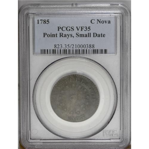 <B>1785 C Nova Nova Constellatio Pointed Rays, Small Date VF35 PCGS.</B></I> Crosby 2-A, R.5. Well struck aside from the all-seeing eye, this piece, this piece has medium brown color and minutely granular surfaces. A few faint marks are near the date and the eye. A very scarce variety. Listed on page 52 of the 2006 <I>Guide Book.</B></I>