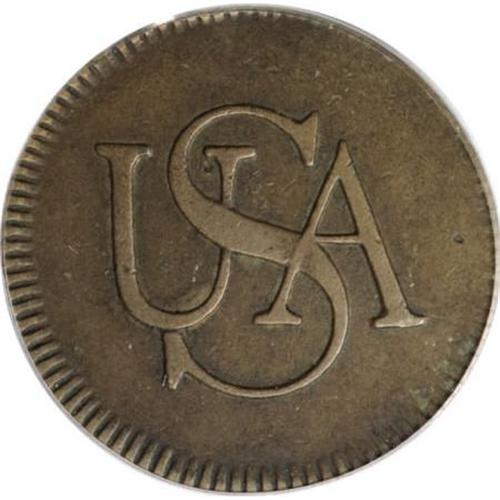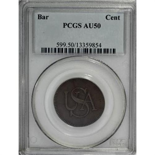 <B>(1785) COPPER Bar Copper AU50 PCGS.</B></I> Breen-1145. The tiny spur on the right end of the second bar, and a slender connecting die break near the reverse center, combine to attribute this desirable Early American variety. The USA monogram design is believed to be based on buttons worn by soldiers in the Revolutionary War. A medium brown example with generally smooth surfaces. The obverse is misaligned slightly toward 1:30. Listed on page 69 of the 2008 <I>Guide Book.</B></I><BR><BR><b>Shipping:</b> Coins & Currency (<a target="_blank" href="http://www.heritageauctions.com/common/shipping.php">view shipping information</a>)