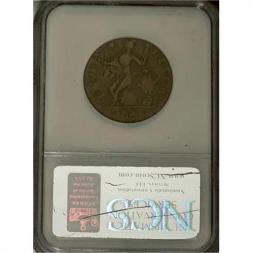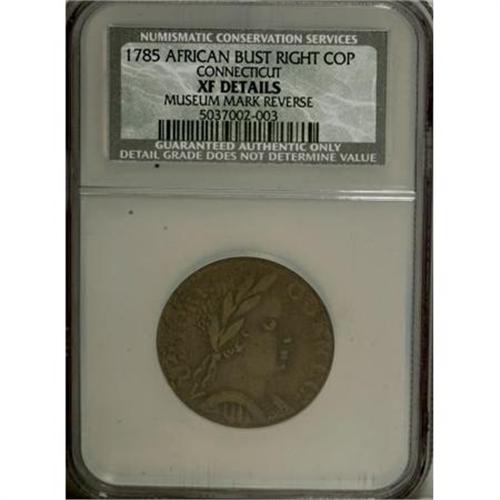 <B>1785 COPPER Connecticut Copper, African Head--Museum Mark Reverse--NCS. XF Details.</B></I> M. 4.1-F.4. The date 1786 is written by hand in ink on the left obverse field, and has been a part of the coin for enough decades that it is part of its history. The peripheral legends are softly brought up, but the types are distinct. The walnut-brown surfaces have surprisingly few marks. Listed on page 58 of the 2008 <I>Guide Book.</B></I><BR><BR><b>Shipping:</b> Coins & Currency (<a target="_blank" href="http://www.heritageauctions.com/common/shipping.php">view shipping information</a>)