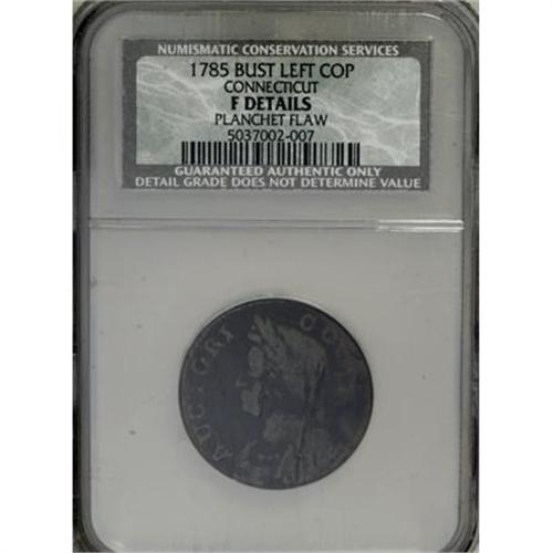 <B>1785 COPPER Connecticut Copper, Bust Left--Planchet Flaw--NCS. Fine Details.</B></I> Miller 7.1-D, High R.4. Although holdered by NCS, the planchet flaw is characteristic of the original coin at the time it was struck, and should not be considered as later damage. This is a pleasing light to medium brown piece with slight surface roughness.<BR><BR><b>Shipping:</b> Coins & Currency (<a target="_blank" href="http://www.heritageauctions.com/common/shipping.php">view shipping information</a>)