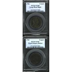 1785 COPPER Connecticut Copper, Bust Right VG8 PCGS, M. 3.5-B, R.4, PCGS has incorrectly designated this coin as 1786, the legends are clear aside from the date, a few planchet flaws (as made) on the reverse; and a 1783 1C Washington & Independence Cent, Draped Bust, Button VF30 PCGS, Baker-5, R.4, Breen states "very scarce," dark purple patina, trivial contact marks on each side. Listed on pages 41 and 58 of the 2003 Guide Book. 2 coins Important notice: We expect to be auctioning lots at the rate of 200-250 per hour. Sometimes eBay Premier live bid software cannot keep up with that pace, so we strongly recommend that you place a realistic proxy bid now as insurance to avoid disappointment. Also please note that all Heritage/CAA lots purchased through eBay Premier carry a 20% Buyer's Premium. Please make sure you read the Terms and Conditions.