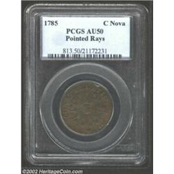 1785 COPPER Nova Constellatio Copper, Pointed Rays AU50 PCGS. Crosby 3-B. The fields have chocolate-brown color, while the devices have tan patina. A minor rim ding above AT in CONSTELLATIO is not a major distraction. The surfaces are relatively free from both verdigris and abrasions. Listed on page 34 of the 2003 Guide Book. Important notice: We expect to be auctioning lots at the rate of 200-250 per hour. Sometimes eBay Premier live bid software cannot keep up with that pace, so we strongly recommend that you place a realistic proxy bid now as insurance to avoid disappointment. Also please note that all Heritage/CAA lots purchased through eBay Premier carry a 20% Buyer's Premium. Please make sure you read the Terms and Conditions.