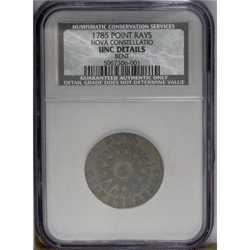 <B>1785 COPPER Nova Constellatio Copper, Pointed Rays--Bent--NCS. Unc. Details.</B></I> Crosby 3-B, R.2. A mild wave in the piece makes the field between CONSTELLATIO and NOVA the high point of the coin. Nonetheless, a pleasing golden-brown example, smooth and properly centered. Listed on page 52 of the 2006 <I>Guide Book.</B></I>