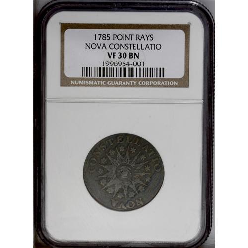 <B>1785<COPPER> Nova Constellatio Copper, Pointed Rays VF30 NGC.</B></I> Crosby 3-B, R.2. Typical die state with breaks in the wreath above the date and showing die deterioration on the obverse. Slightly granular but well struck overall with dark-brown surfaces. Listed on page 52 of the 2007 <I>Guide Book.</B></I>