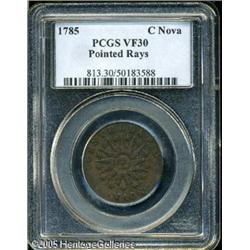 <B>1785 COPPER Nova Constellatio Copper, Pointed Rays VF30 PCGS.</B></I> Crosby 4-D, R.4. Magnification shows surfaces that are just a bit roughened by handling in circulation with very slight evidence of corrosion on the reverse. Medium brown patina on the obverse with significantly deeper color over the reverse. Listed on page 40 of the 2005 <I>Guide Book.</B></I> Lot:5059