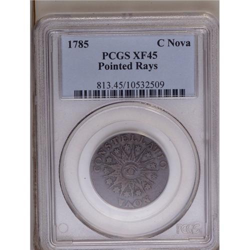 <B>1785<COPPER> Nova Constellatio Copper, Pointed Rays XF45 PCGS.</B></I> Crosby 3-B, R.2. A smooth lavender-brown example of this popular pre-Federal type. A few wispy marks are concealed on the lower right obverse field. Struck from late dies, with crumbling particularly evident on NOVA and nearby stars. Listed on page 52 of the 2007 <I>Guide Book.</B></I>