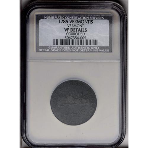 <B>1785<COPPER> Vermont Copper, VERMONTS--Corroded--NCS. VF Details.</B></I> RR-2, Bressett 1-A, R.2. This dark and partly porous example has sharp major devices and some weakness along the left border legends. The date is faint but legible. Listed on page 68 of the 2006 <I>Guide Book.</B></I><BR><I>From The Steve Glenn Collection, Part Two.</B></I>