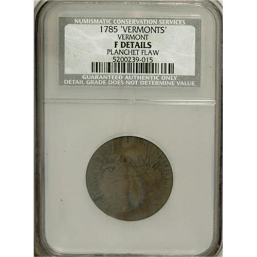 <B>1785 COPPER Vermont Copper, VERMONTS--Planchet Flaw--NCS. Fine Details.</B></I> NGC Census: (0/0). PCGS Population (8/36). (#539)<BR><BR><b>Shipping:</b> Coins & Currency (<a target="_blank" href="http://www.heritageauctions.com/common/shipping.php">view shipping information</a>)