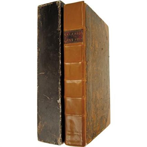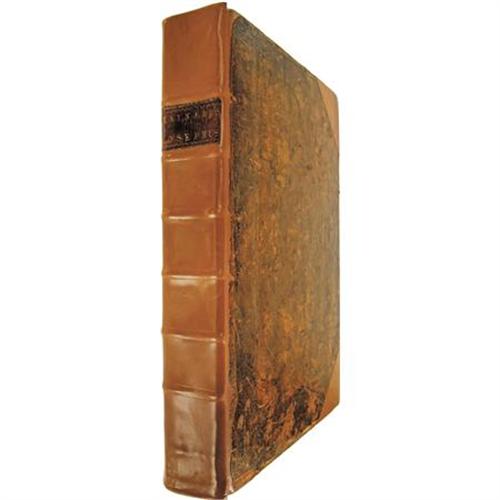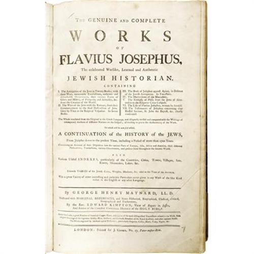 <B> Maynard's Josephus Flavius Josephus: The Genuine and Complete Works of Flavius Josephus</B></I>, <I>the Celebrated Warlike, Learned and Authentic Jewish Historian...The Whole Translated from the Original in the Greek Language... And A Continuation of the History of the Jews, From Josephus Down to the Present Time, Including a Period of More Than 1700 Years... Also Various Useful Indexes... By George Henry Maynard... Illustrated With Marginal References... By Edward Kimpton... Embellished With a Great Number of Beautiful Copper Plates... From Original Drawings of the Ingenious Messrs. Metz, Stothard, and Corbould, Members of the Royal Academy, and other Eminent Artists. The Whole Engraved by the Most Capital Performers, Particularly Grignion, Collier, Heath, Tookey, Taylor, &c.</B></I> (London: Printed for J. Cooke, 1785), vi, 723 pages, with frontis and 59 additional engravings including two maps, old leather with modern compartmented spine (original leather label attached) and corners, folio (10" x 15"), with slipcase. A majestic printing of Josephus' works with wonderful illustrations by the most talented of London's artists and engravers of the period. Pages lightly age-toned, infrequent and light foxing but generally bright, binding sturdy, slipcase sturdy but scuffed, overall very good.<BR><BR><b>Shipping:</b> Books & Catalogs (<a target="_blank" href="http://www.heritageauctions.com/common/shipping.php">view shipping information</a>)