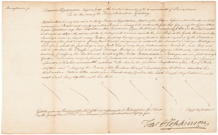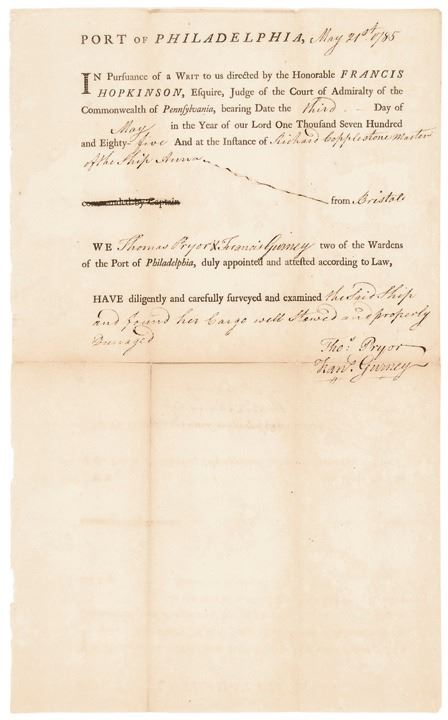 May 3, 1785-Dated, Manuscript Document Signed, “Fras Hopkinson” as Judge of the Admiralty Court of Pennsylvania, 1 page, measuring 12.5” x 7.75”, Philadelphia, PA, Very Fine. Also included is the May 21, 1785-Dated “Report of Survey on the Ship Anna Capt Copplestone from Bristol,” being a partially-printed document signed “Thos Pryor” and “Frans Gurney” as Wardens of the Port of Philadelphia, 1 page, 9” x 14.5”, Choice Very Fine. Headed: “Francis Hopkinson, Esquire, Judge of the Court of admiralty of the Commonwealth of Pennsylvania. To the Wardens of the Port of Philadelphia, Greeting:” It reads, in full: