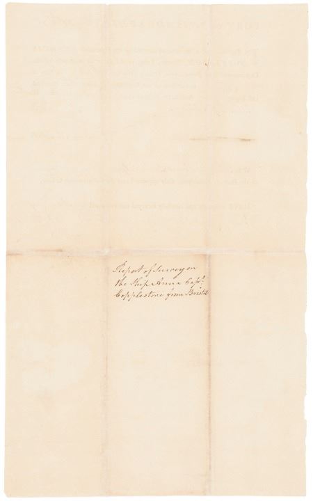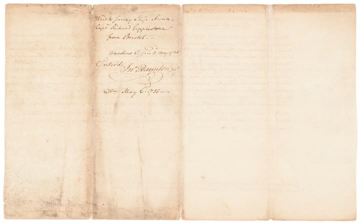 “Application having been made to Me by Richard Copplestone Master of the Ship or Vessel, called The Anna lately arrived from Bristol and now lying in this Port, for a Survey to be made on the said Ship You,or any two of you, taking to your Assistance my Ship-Carpenter or other Tradesman if you shall think it necessary to do so, are hereby directed and required diligently and carefully to Survey and examine as well the said Ship as the Goods, Wares, and Mechandizes laden on board, or any Parts or portions thereof, as you shall be thereto requested by the Owners or Consignees of the said Cargo or of any part thereof; and you are to estimate the Amount of Damage, Wastage or Loss, to the best of your Skill and Judgment, particularly specifying the Marks and Numbers of the Bales, Boxes, Casks or Packages, where such damaged Goods or Deficiencies may be found: In pursuance and according to the Direction of an Act of General Assembly of the Commonwealth, entitled ‘An Act for the further Regulation of the Port of Philadelphia, and ‘enlarging the Powers of the Wardens thereof;’ And how you Shall have executed this Writ made a Return to Me, under your Hands duly signed on the Sixth Day of May Instant or on the next Court Day together with this writ...”