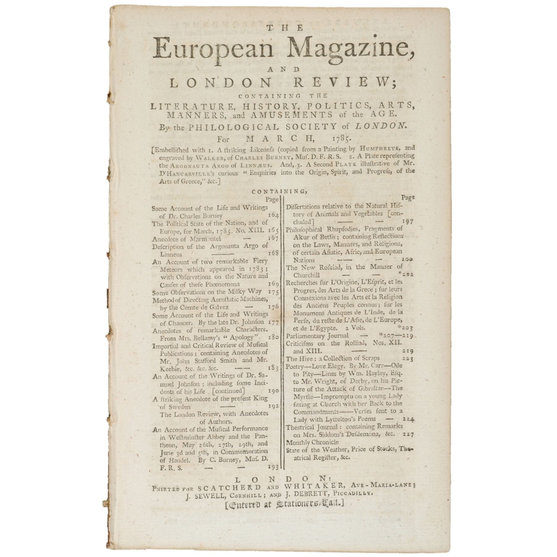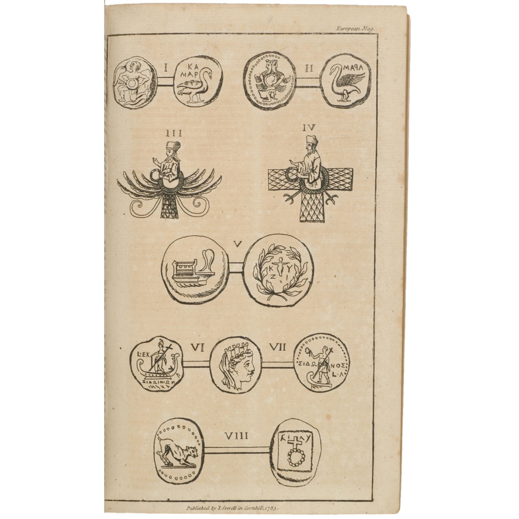 1785-Dated The European Magazine & London Review, Lot of 3 Issues, Containing an account of an attempt to cross the English Channel from Dublin by Balloon, and Engravings of Greek Coins, a Captain Cook Medal, an Octopus and other subjects, Extremely Fine.