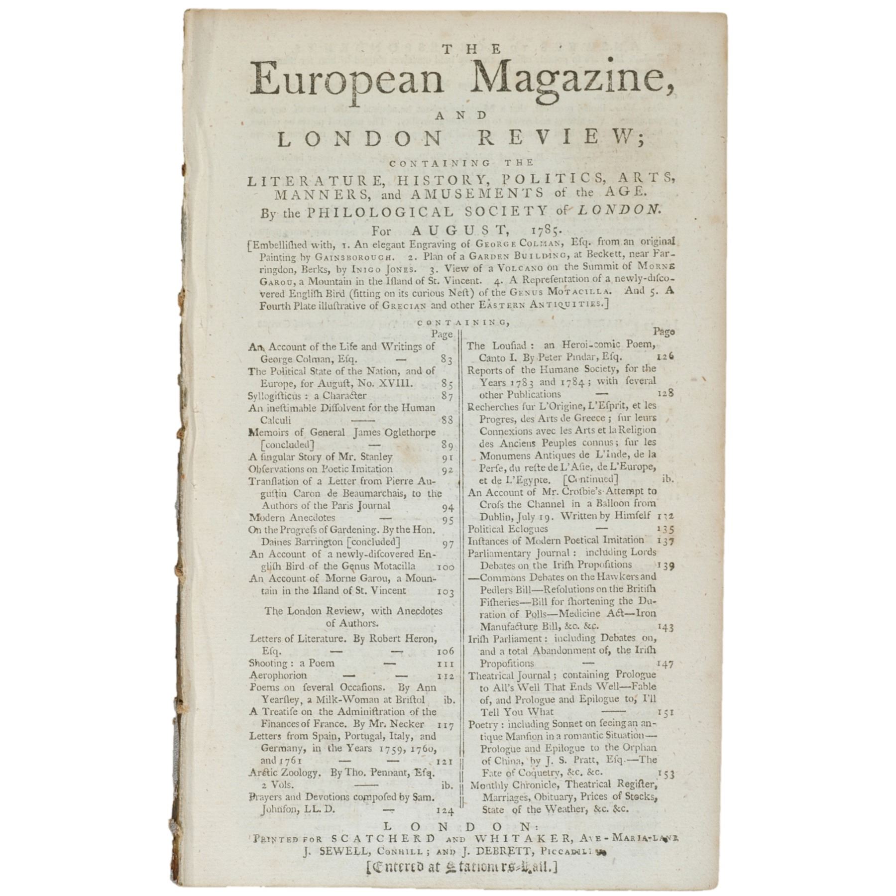 3. August 1785, containing an account of Crosbie’s attempt to cross the English Channel by Balloon from Dublin, an account and engraving of the volcano on the island of St. Vincent, and an engraving of ancient Greek coins. (3 items).