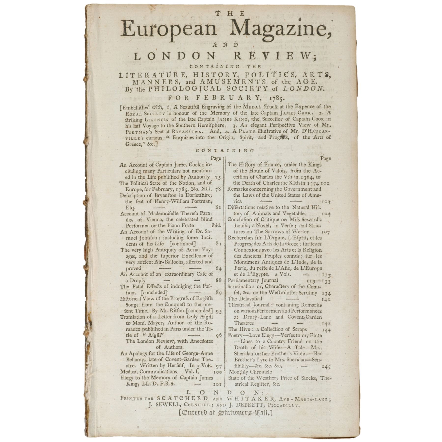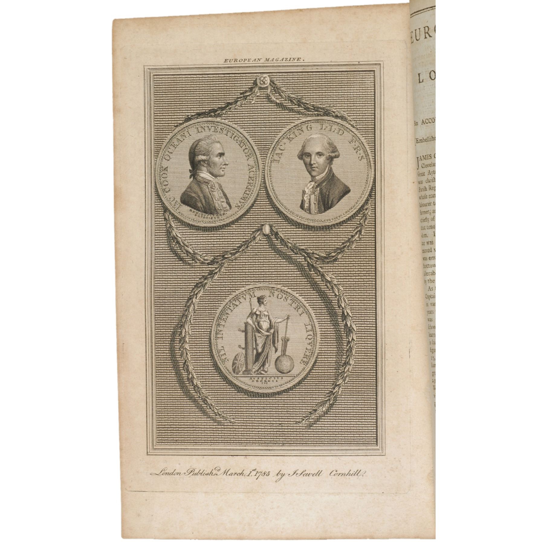 1. February 1785, containing an account of Captain James Cook and an engraving of a Medal in his honor made for the Royal Society, an engraving of Cook’s successor, Captain James King, and an account of Balloon flight in antiquity!