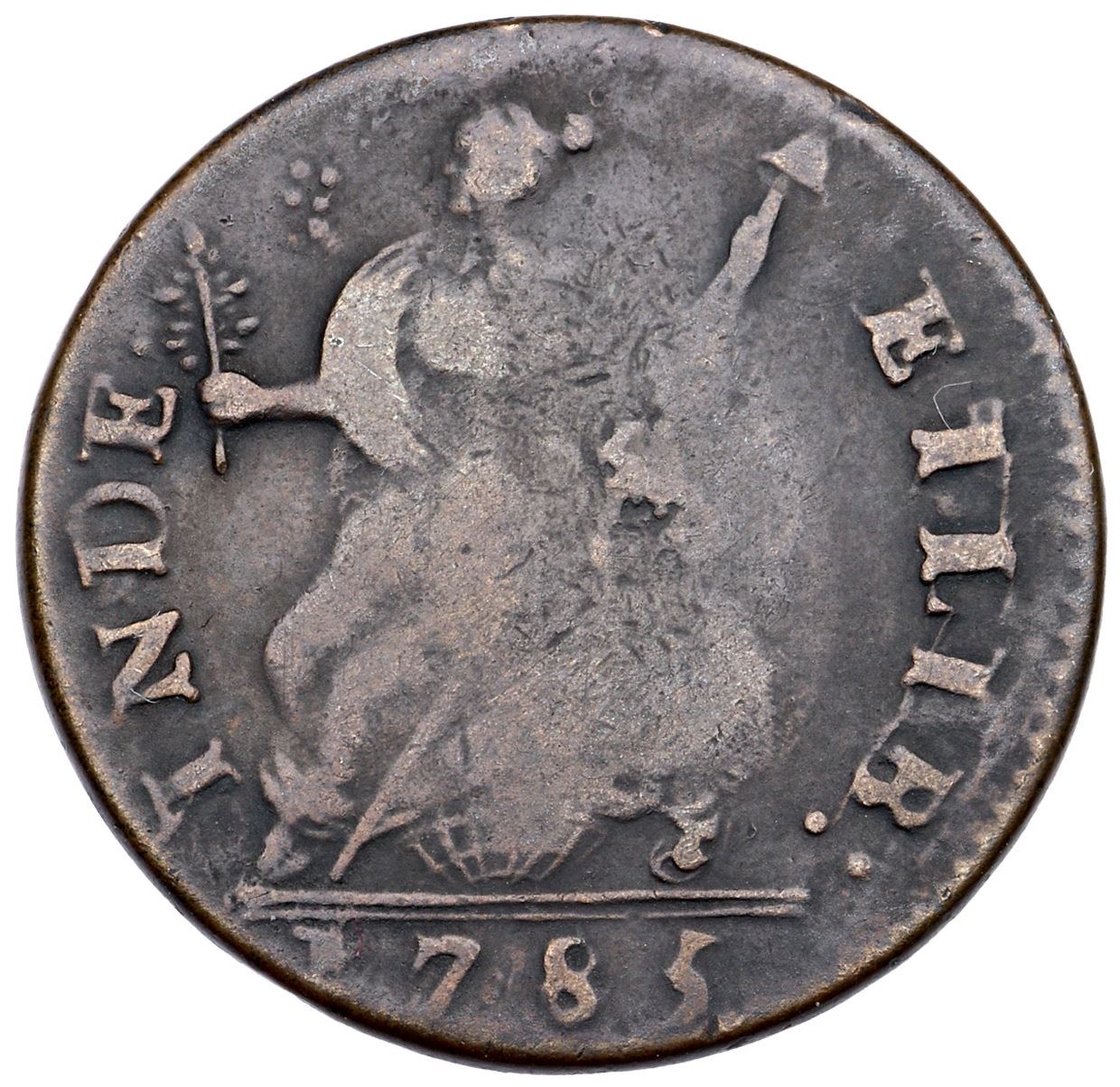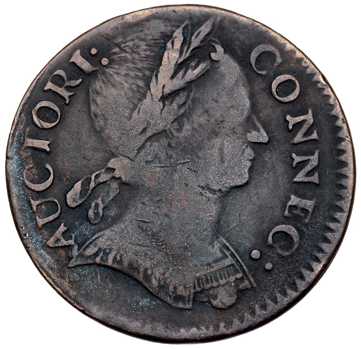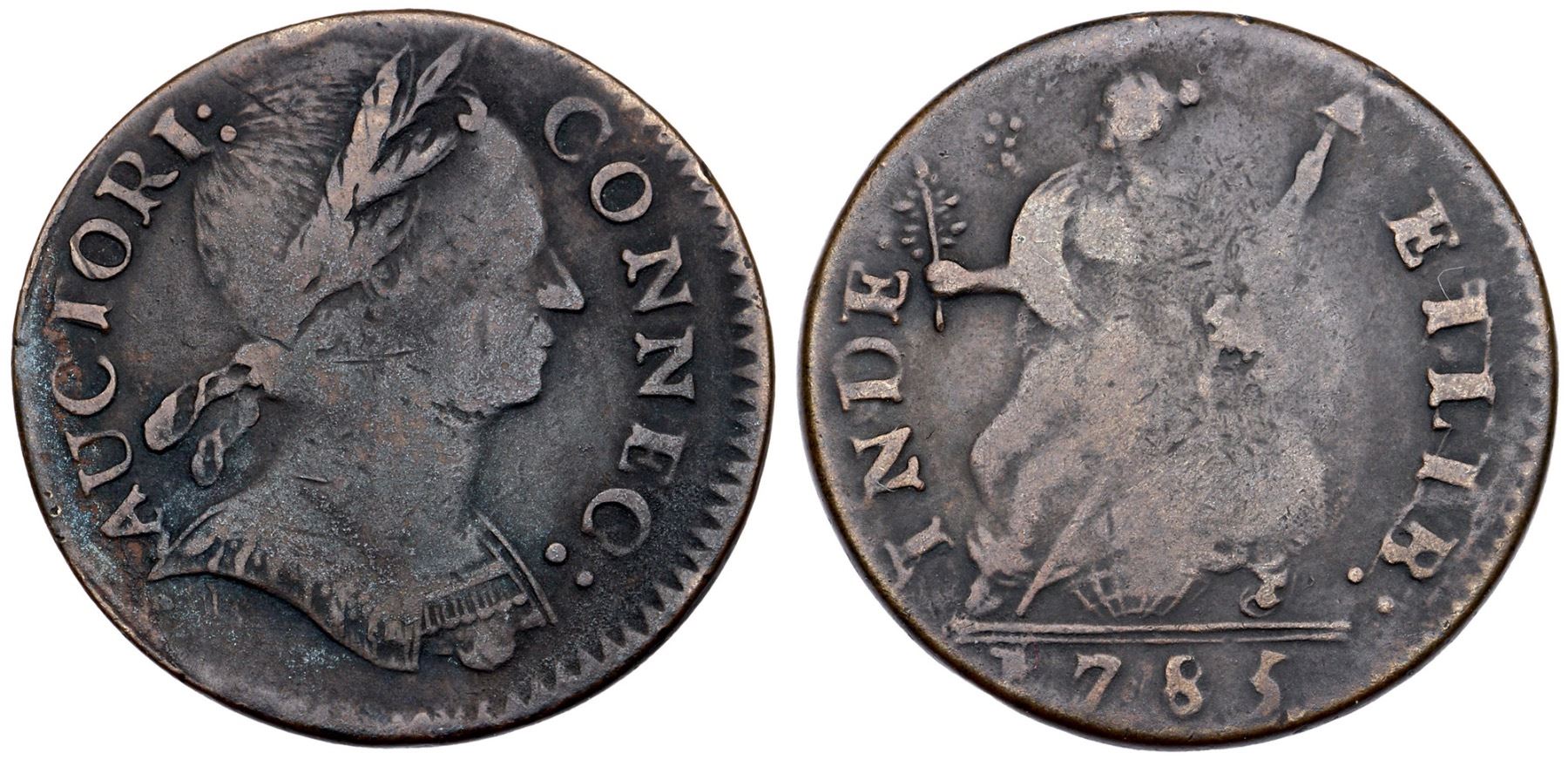 1785 Miller 6.4-I R-2 MBR Connecticut VG8Fine sharpness but lightly corroded with microgranularity covering the surfaces and traces of shallow scale around AUCT. Slightly glossy deep charcoal patina with lighter chocolate brown on some of the high points. Free of notable marks otherwise, bold date and legends. Ex; Doug Durasoff